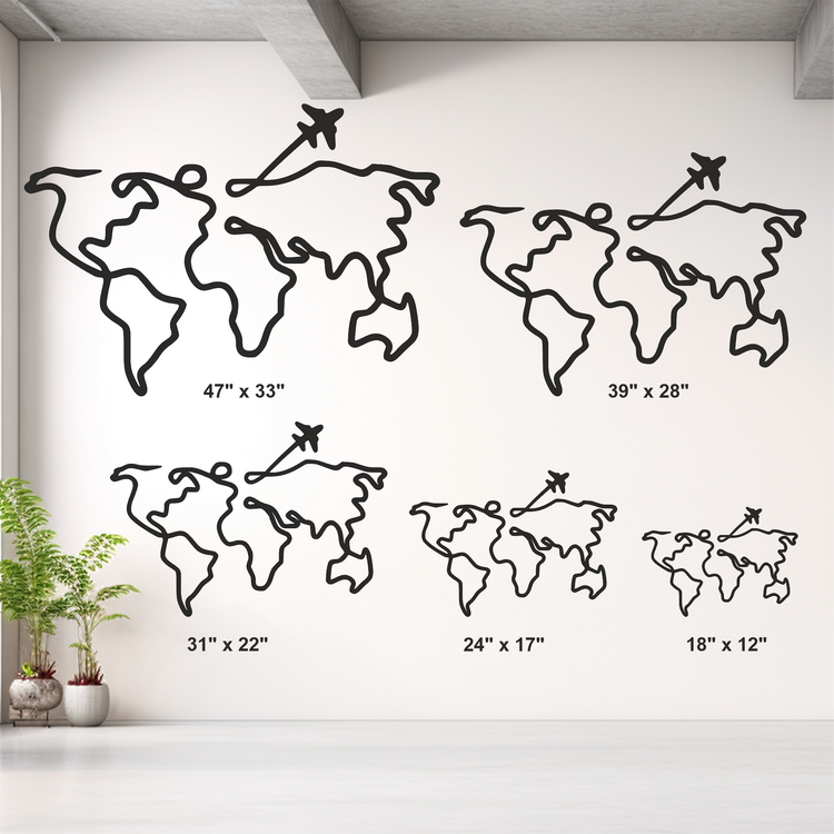 Its minimalist silhouette design matches contemporary, industrial, and modern interiors seamlessly. Available in multiple size options, the airplane world map wall decor can be used as a compact accent or a bold centerpiece. Built from durable black metal, it ensures longevity while being easy to install.